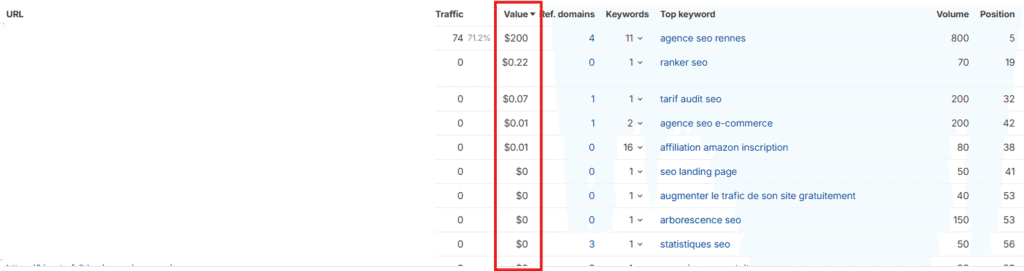 Attention à la rentabilité des mots-clés, j’aime bien utiliser Ahrefs pour regarder la valeur du trafic sur un mot-clé. La valeur de trafic est le montant qu’il faudrait dépenser pour se placer en SEM (ads).