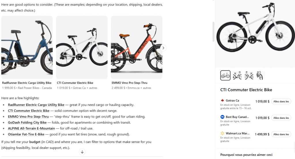 ChatGPT propose désormais, pour les requêtes transactionnelles (“meilleure montre connectée”, “caméra de sécurité pas chère”), une shortlist de produits présentée sous forme de cartes.